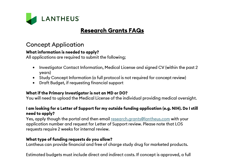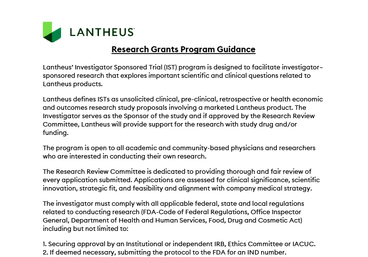 Lantheus provides grants to support clinical, pre-clinical, retrospective or health economic and outcomes research study proposals involving a marketed Lantheus product. Grants may be awarded for the funding of specific research protocols exploring novel applications and evidence-based clinical practice in specific areas of interest.