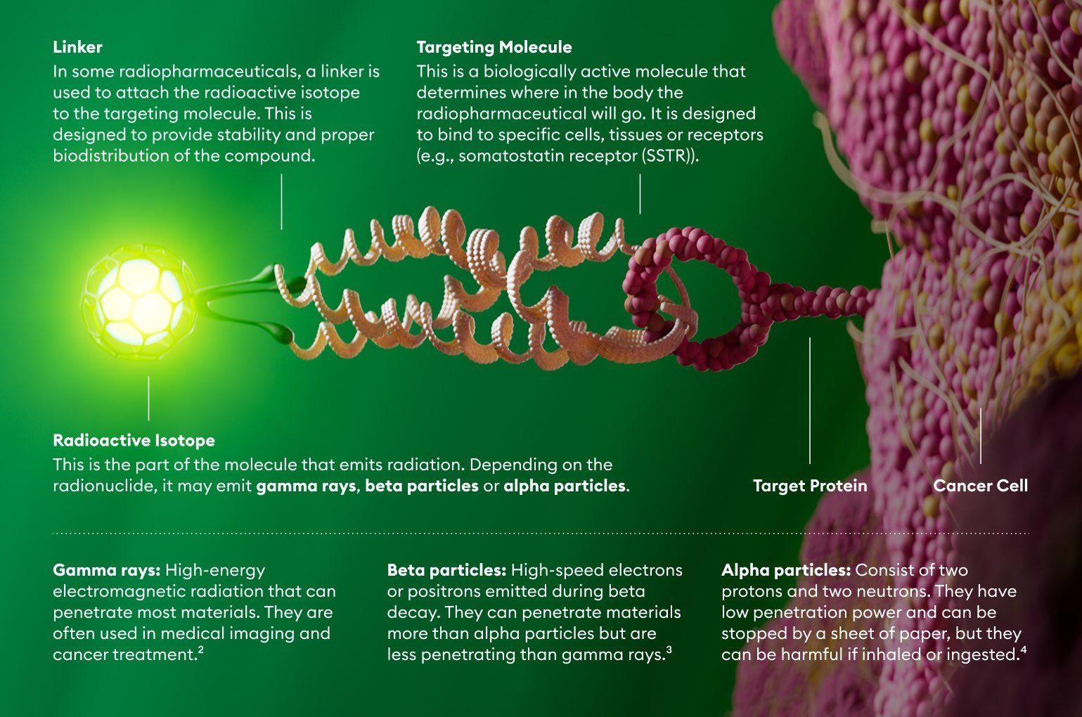 1. The Chemical Scaffold of Theranostic Radiopharmaceuticals: Radionuclide, Bifunctional Chelator, and Pharmacokinetics Modifying Linker. National Library of Medicine. Published May 10, 2022. Accessed May 21, 2025. https://pubmed.ncbi.nlm.nih.gov/35630536/ 2. Gamma Radiation: Its Discovery, Applications, and Safety Considerations. Open MedScience. Published July 2, 2024. Accessed May 21, 2025. https://openmedscience.com/gamma-radiation-its-discovery-applications-and-safety-considerations/ 3. Beta Particle. Nuclear Power. Accessed May 21, 2025. https://www.nuclear-power.com/nuclear-power/reactor-physics/atomic-nuclear-physics/fundamental-particles/beta-particle/ 4. Properties of Radioactive Isotopes: An Overview. U.S. Centers for Disease Control and Prevention. Published February 22, 2024. Accessed May 21, 2025. https://www.cdc.gov/radiation-health/about/radioactive-isotopes.html 5. Production and Quality Control of Fluorine-18 Labelled Radiopharmaceuticals. International Atomic Energy Agency. Published 2021. Accessed May 21, 2025. https://www.iaea.org/publications/14925/production-and-quality-control-of-fluorine-18-labelled-radiopharmaceuticals 6. Radiopharmaceuticals: Navigating the Frontier of Precision Medicine and Therapeutic Innovation. National Library of Medicine. Published January 5, 2024. Accessed May 21, 2025. https://pubmed.ncbi.nlm.nih.gov/38183131/